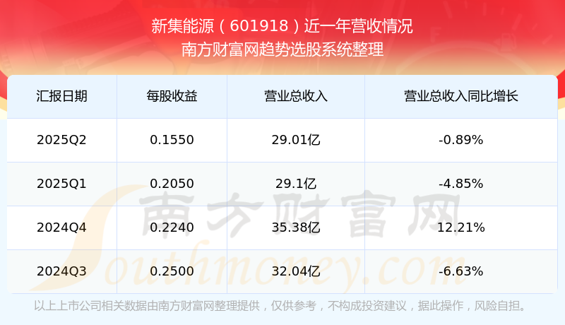 新集能源2025年第二季度公司实现营业收入29.01亿元,同比-0.89%;归母净利润3.89亿元,同比-32.79%。