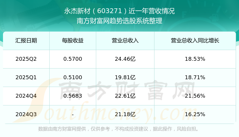 永杰新材2025年第二季度显示,公司主营收入24.46亿元,同比18.53%;归母净利润1.1亿元,同比13.53%;扣非净利润1.06亿元,同比8.6%;