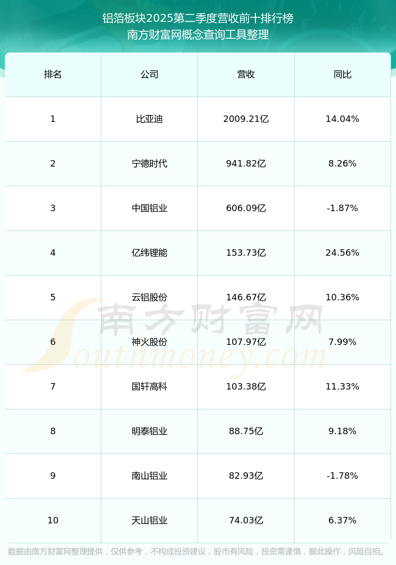 按照南方财富网概念查询工具统计,该股所属板块为铝箔板块,该板块共有31只股票,永杰新材2025第二季度营收在该板块中排名为第18名,该板块2025第二季度营收排名前十的股票如下表: