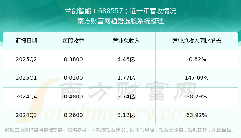 兰剑智能(688557)发布2025年第二季度财报。2025年第二季度兰剑智能实现营业收入4.46亿元,同比增加-0.82元%,环比增加151.49%;净利润为3971.77万元,同比增长-16.91%,环比增长2314.53%。