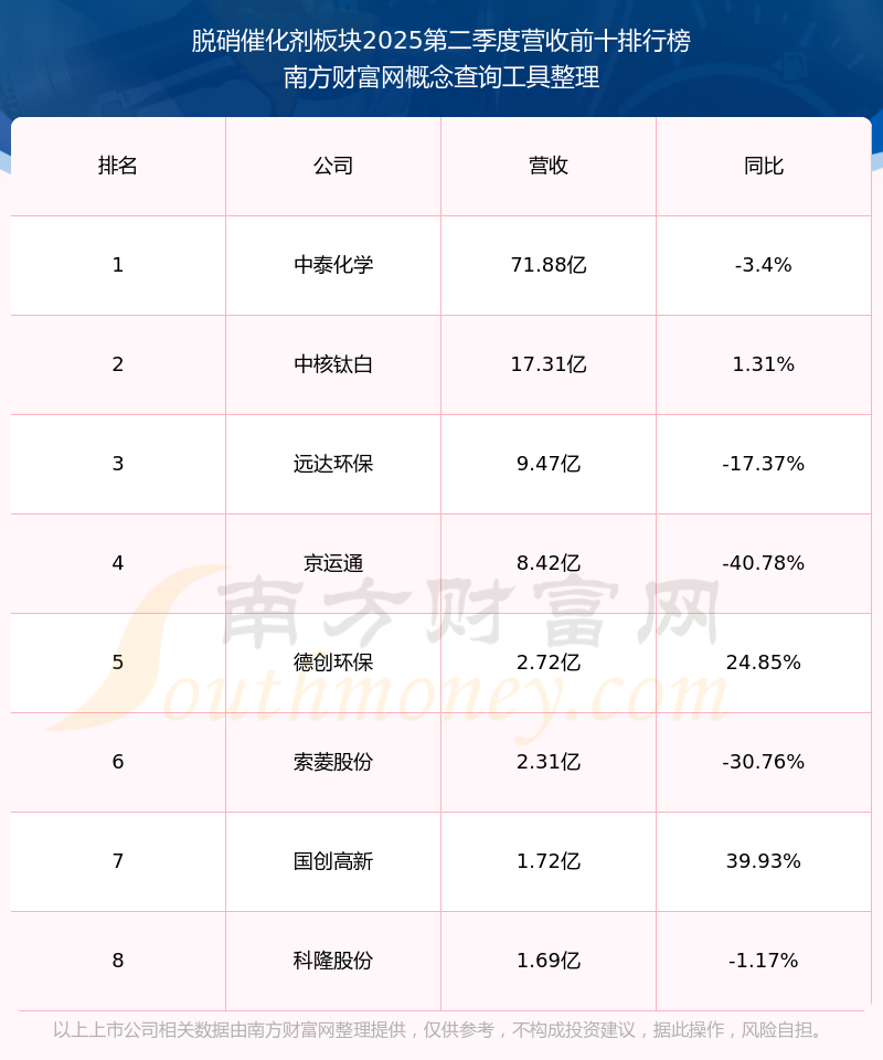 按照南方财富网概念查询工具统计,该股所属板块为脱硝催化剂板块,该板块共有8只股票,元琛科技2025第二季度营收在该板块中排名为第8名,该板块2025第二季度营收排名前十的股票如下表: