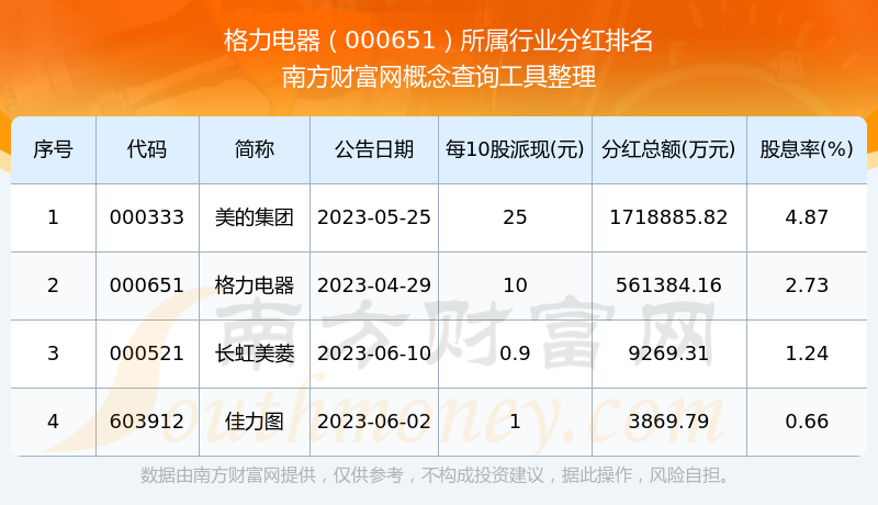 按照南方财富网趋势选股系统统计,格力电器所属行业为空调行业,空调行业分红排名情况如下表: