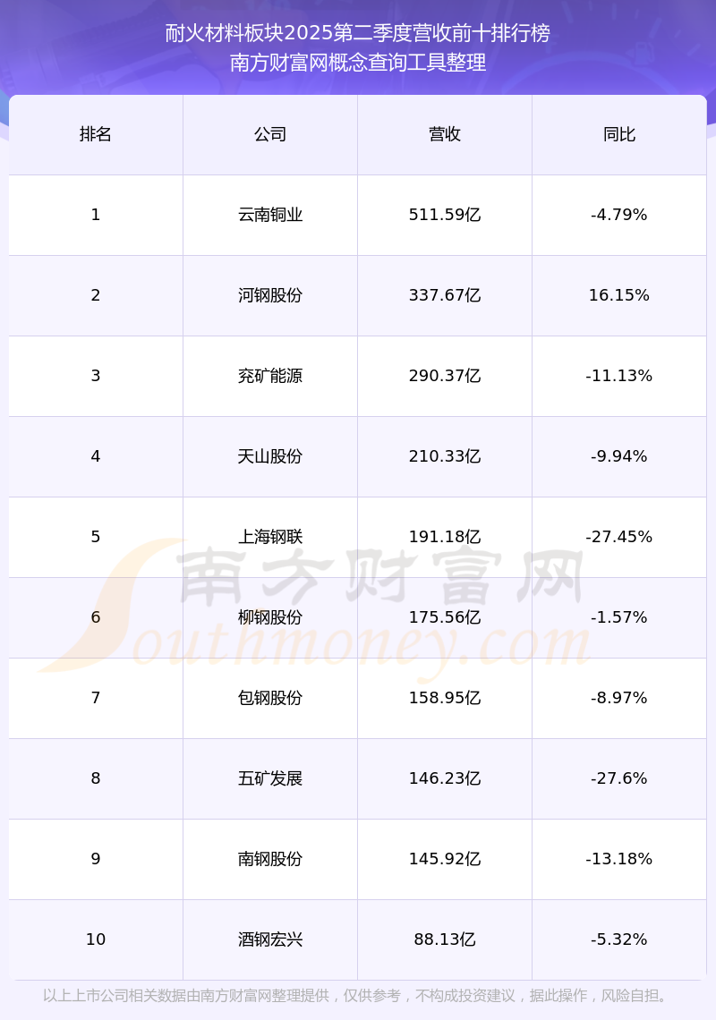 按照南方财富网概念查询工具统计,该股所属板块为耐火材料板块,该板块共有38只股票,中钢洛耐2025第二季度营收在该板块中排名为第26名,该板块2025第二季度营收排名前十的股票如下表: