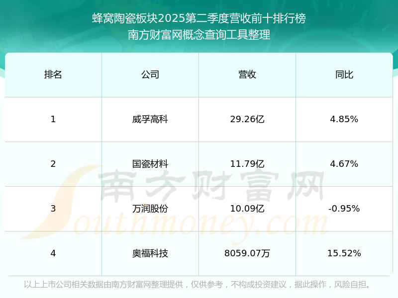 按照南方财富网概念查询工具统计,该股所属板块为蜂窝陶瓷板块,该板块共有4只股票,奥福科技2025第二季度营收在该板块中排名为第4名,该板块2025第二季度营收排名前十的股票如下表: