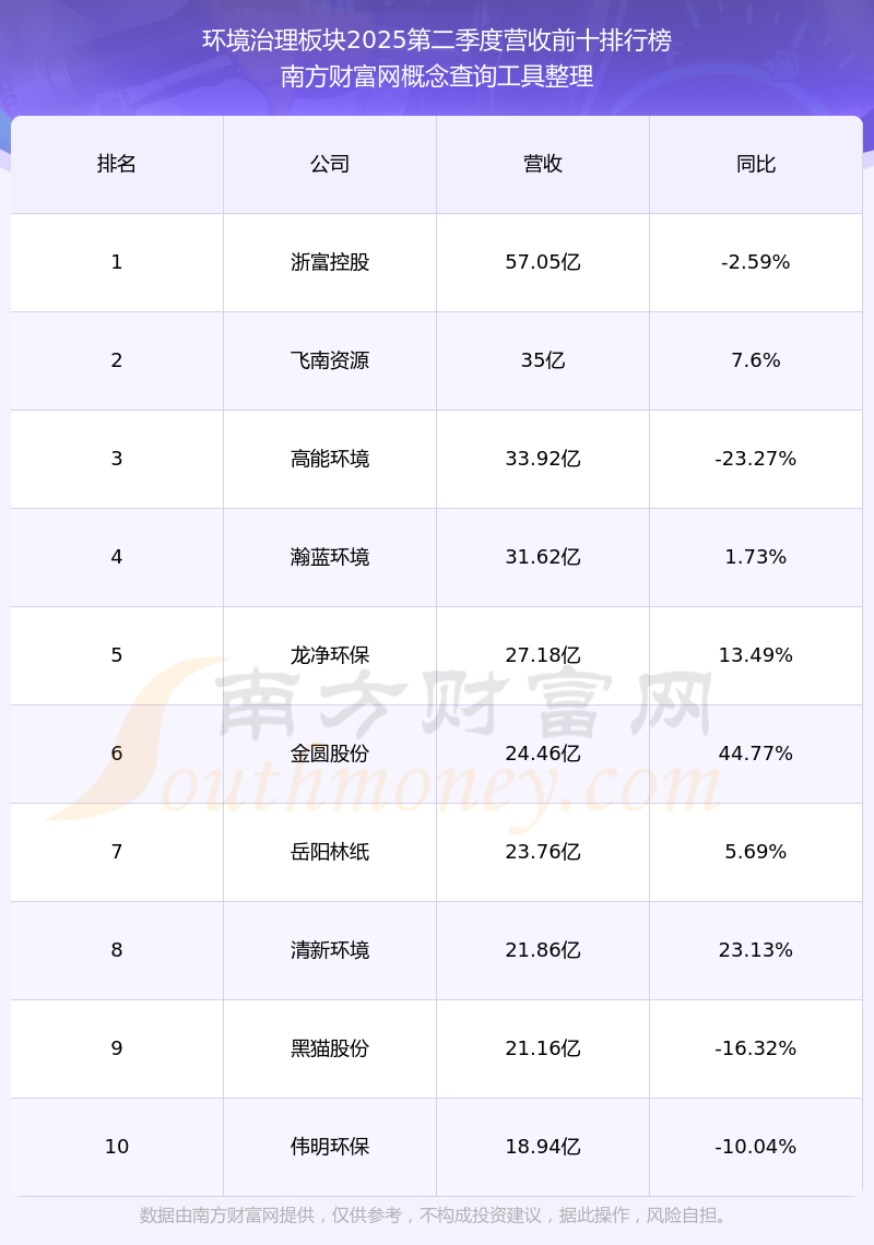 按照南方财富网概念查询工具统计,该股所属板块为环境治理板块,该板块共有125只股票,德林海2025第二季度营收在该板块中排名为第111名,该板块2025第二季度营收排名前十的股票如下表: