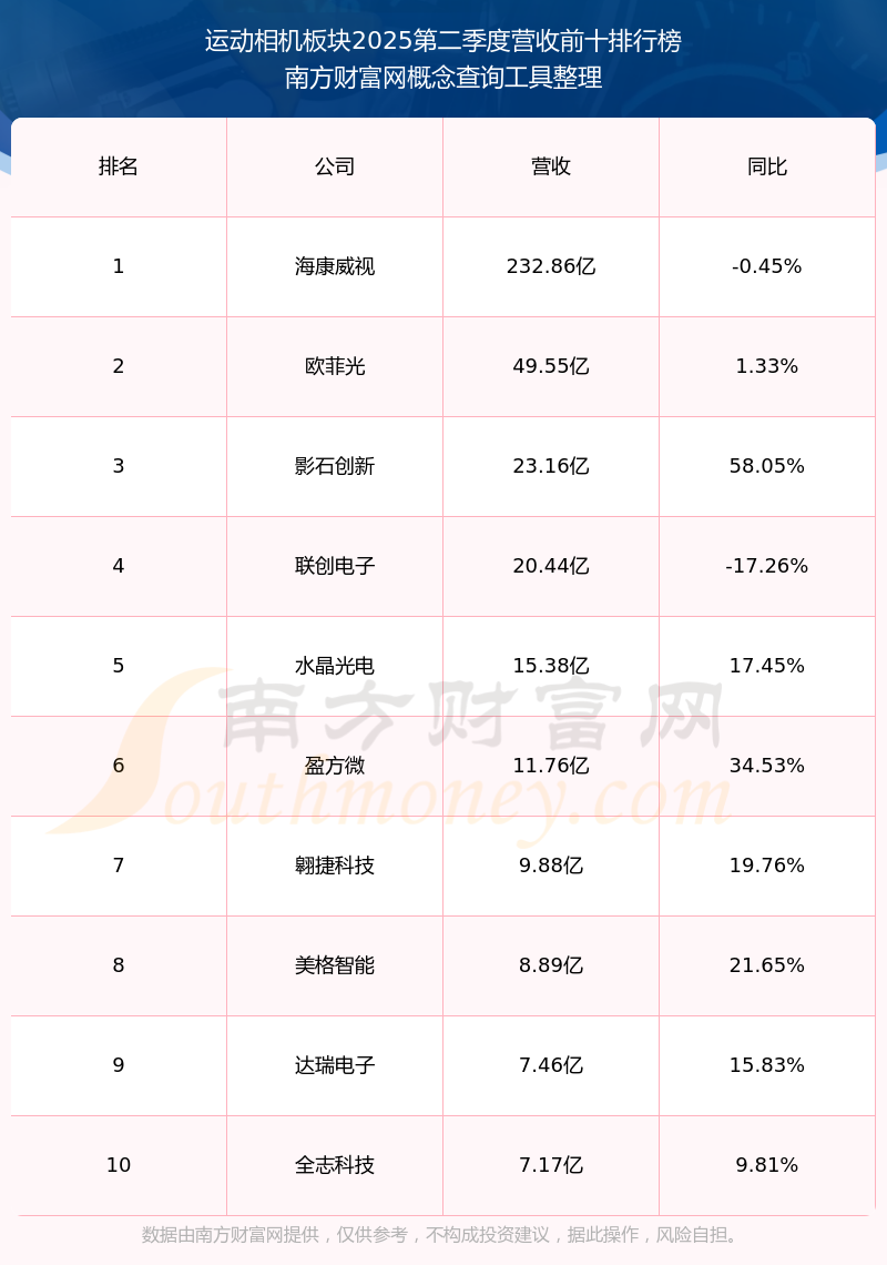 按照南方财富网概念查询工具统计,该股所属板块为运动相机板块,该板块共有14只股票,影石创新2025第二季度营收在该板块中排名为第3名,该板块2025第二季度营收排名前十的股票如下表: