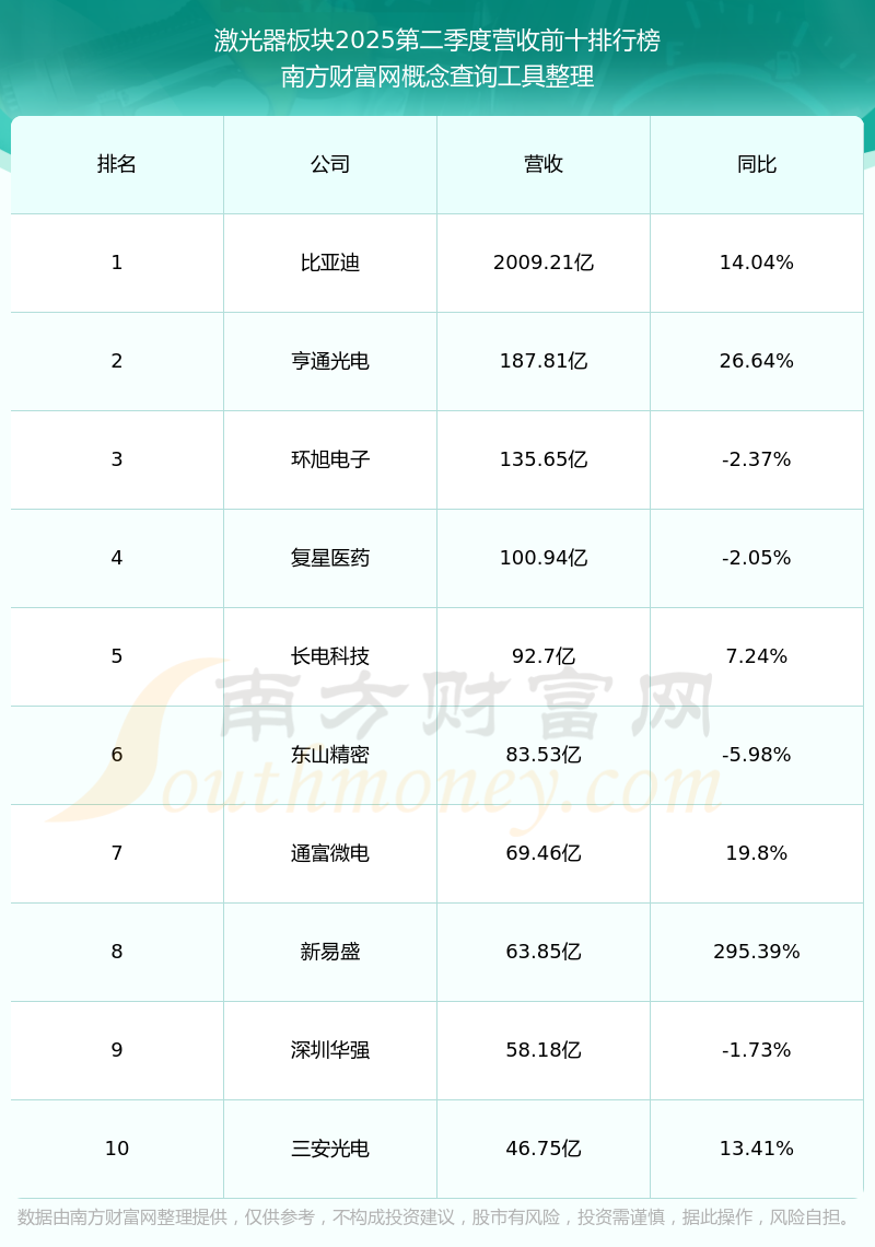 按照南方财富网概念查询工具统计,该股所属板块为激光器板块,该板块共有58只股票,德龙激光2025第二季度营收在该板块中排名为第49名,该板块2025第二季度营收排名前十的股票如下表: