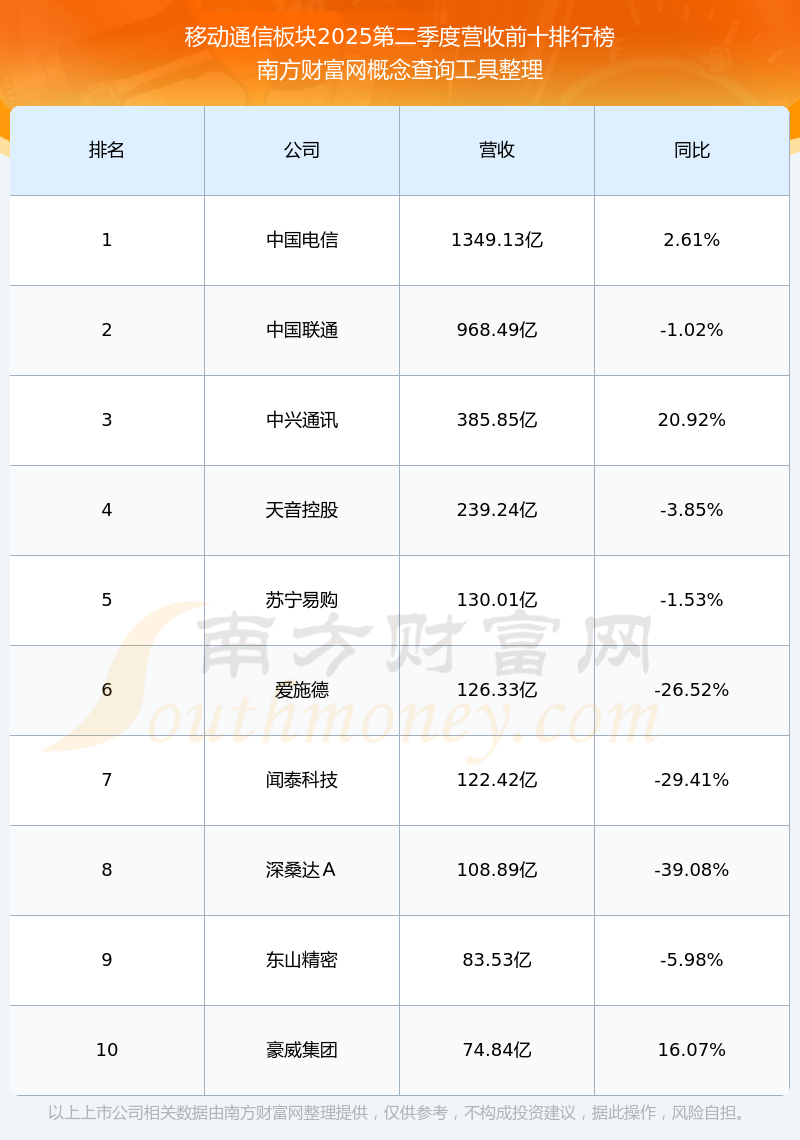 按照南方财富网概念查询工具统计,该股所属板块为移动通信板块,该板块共有105只股票,东方通信2025第二季度营收在该板块中排名为第52名,该板块2025第二季度营收排名前十的股票如下表: