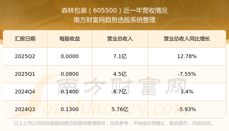 在2025年第二季度,森林包装的业绩表现,主营业务收入达到7.1亿元,实现了12.78%的同比增长率。同时,公司归母净利润录得-274.82万元,同比增长-106.28%。