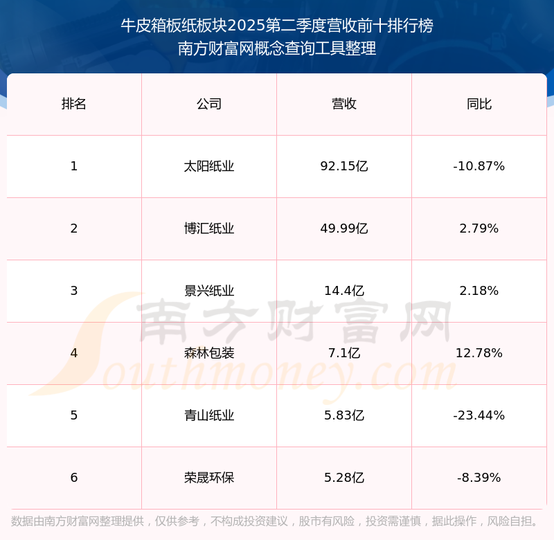 按照南方财富网概念查询工具统计,该股所属板块为牛皮箱板纸板块,该板块共有6只股票,森林包装2025第二季度营收在该板块中排名为第4名,该板块2025第二季度营收排名前十的股票如下表: