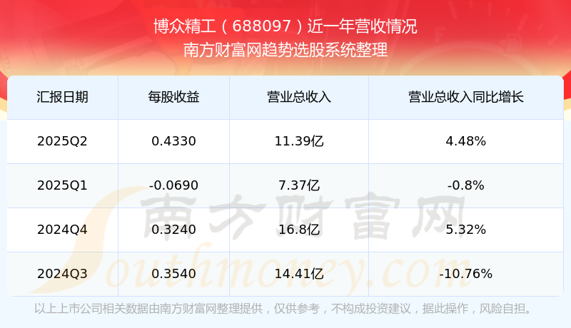 博众精工2025年第二季度财报显示,公司主营收入11.39亿元,同比4.48%;归母净利润1.94亿元,同比65.31%;扣非净利润1.13亿元,同比-7.79%。
