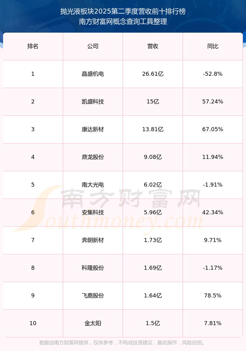 按照南方财富网概念查询工具统计,该股所属板块为抛光液板块,该板块共有13只股票,安集科技2025第二季度营收在该板块中排名为第6名,该板块2025第二季度营收排名前十的股票如下表: