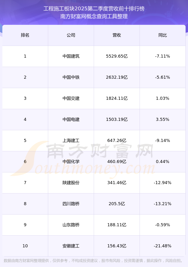按照南方财富网概念查询工具统计,该股所属板块为工程施工板块,该板块共有56只股票,中铝国际2025第二季度营收在该板块中排名为第56名,该板块2025第二季度营收排名前十的股票如下表: