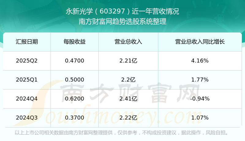 永新光学2025年第二季度公司实现营业收入2.21亿元,同比4.16%;归母净利润5264.93万元,同比-2.55%。