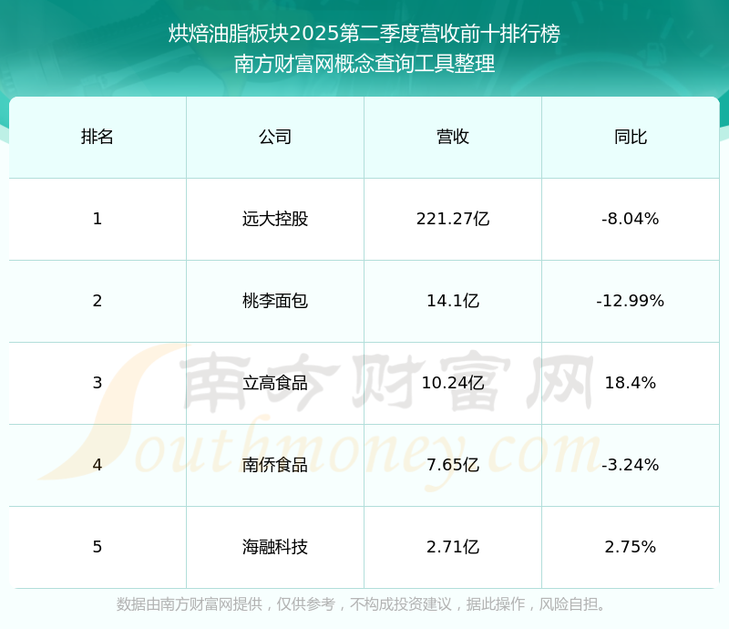 按照南方财富网概念查询工具统计,该股所属板块为烘焙油脂板块,该板块共有5只股票,南侨食品2025第二季度营收在该板块中排名为第4名,该板块2025第二季度营收排名前十的股票如下表: