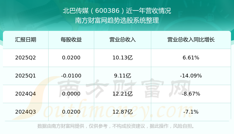 在2025年第二季度,北巴传媒的业绩表现,主营业务收入达到10.13亿元,实现了6.61%的同比增长率。同时,公司归母净利润录得1448.59万元,同比增长-13.06%。