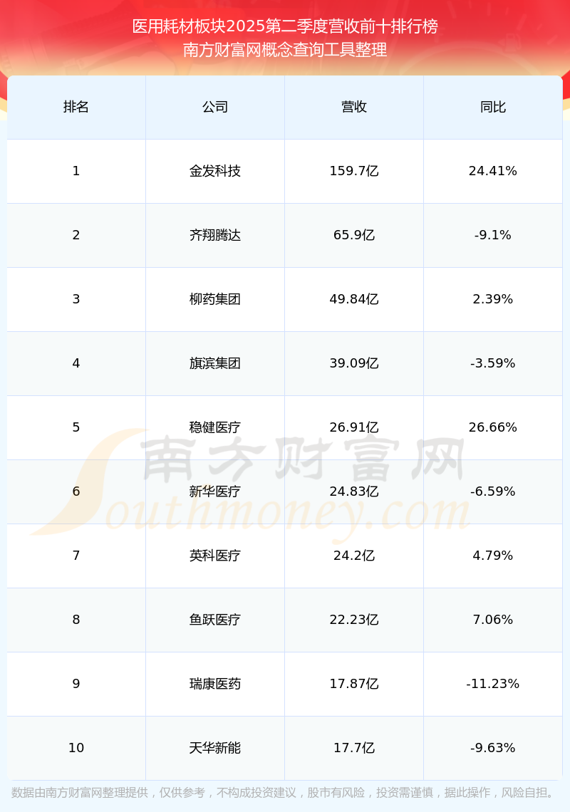 按照南方财富网概念查询工具统计,该股所属板块为医用耗材板块,该板块共有99只股票,迈得医疗2025第二季度营收在该板块中排名为第86名,该板块2025第二季度营收排名前十的股票如下表: