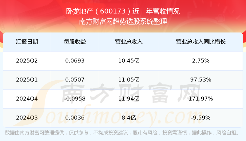 于2025年第二季度,卧龙地产披露了其业绩表现,其中主营业务收入10.45亿元,相较于去年同期2.75%。此外,公司归属于母公司的净利润为4651.1万元,同比增长了-28.73%。在扣除所有非经常性损益后,净利润1321.48万元,同比增长-77.86%。