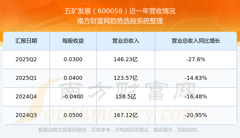 五矿发展(600058)披露2025年第二季度报告,报告期实现营收146.23亿元,同比-27.6%;归母净利润4063.14万元,同比-74.35%;扣非净利润-1905万元,同比-138.7%。