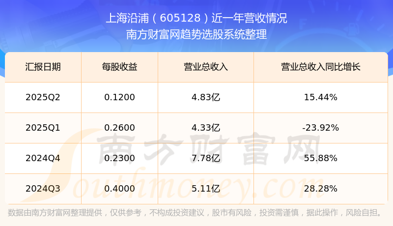 上海沿浦披露了2025年第二季度财报。报告显示,上海沿浦2025年第二季度实现营收4.83亿元,同比15.44%;归母净利润4515.58万元,同比51.22%。