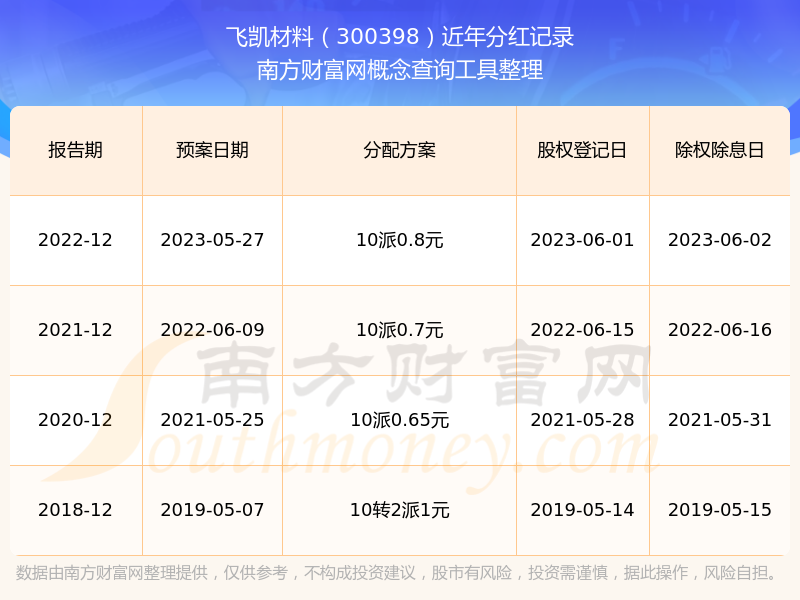 飞凯材料最新一次公布的分红方案为10派0.8元。本次权益分派股权登记日为2023年6月1日,除权除息日为2023年6月2日,派息日为2023年6月2日。