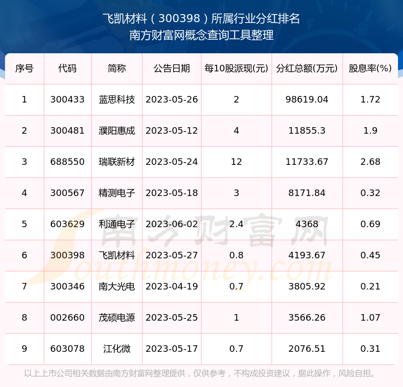 按照南方财富网趋势选股系统统计,飞凯材料所属行业为光刻胶行业,光刻胶行业分红排名情况如下表: