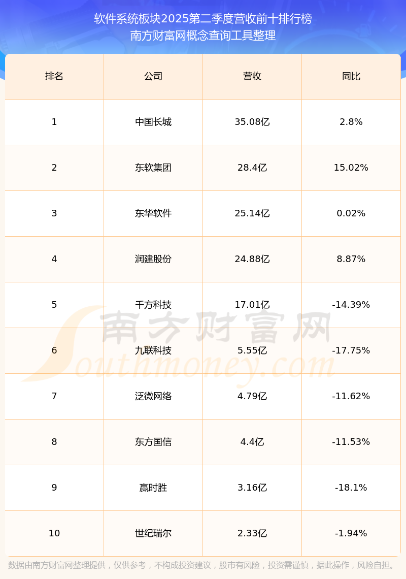 按照南方财富网概念查询工具统计,该股所属板块为软件系统板块,该板块共有22只股票,航天宏图2025第二季度营收在该板块中排名为第22名,该板块2025第二季度营收排名前十的股票如下表: