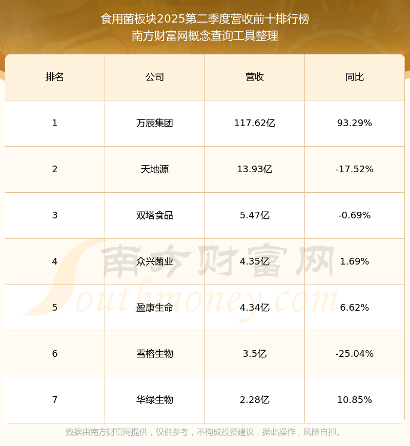 按照南方财富网概念查询工具统计,该股所属板块为食用菌板块,该板块共有7只股票,博闻科技2025第二季度营收在该板块中排名为第7名,该板块2025第二季度营收排名前十的股票如下表: