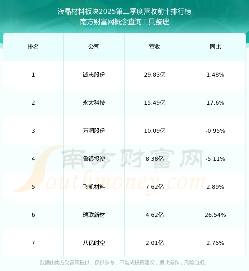 按照南方财富网概念查询工具统计,该股所属板块为液晶材料板块,该板块共有7只股票,八亿时空2025第二季度营收在该板块中排名为第7名,该板块2025第二季度营收排名前十的股票如下表:
