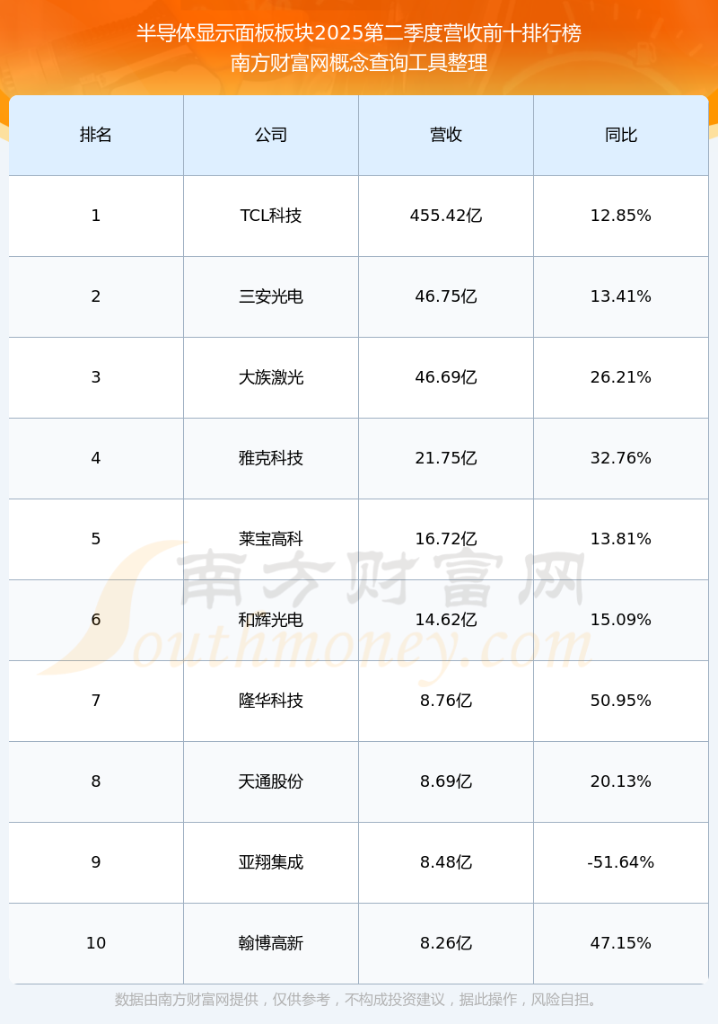 按照南方财富网概念查询工具统计,该股所属板块为半导体显示面板板块,该板块共有21只股票,和辉光电2025第二季度营收在该板块中排名为第6名,该板块2025第二季度营收排名前十的股票如下表:
