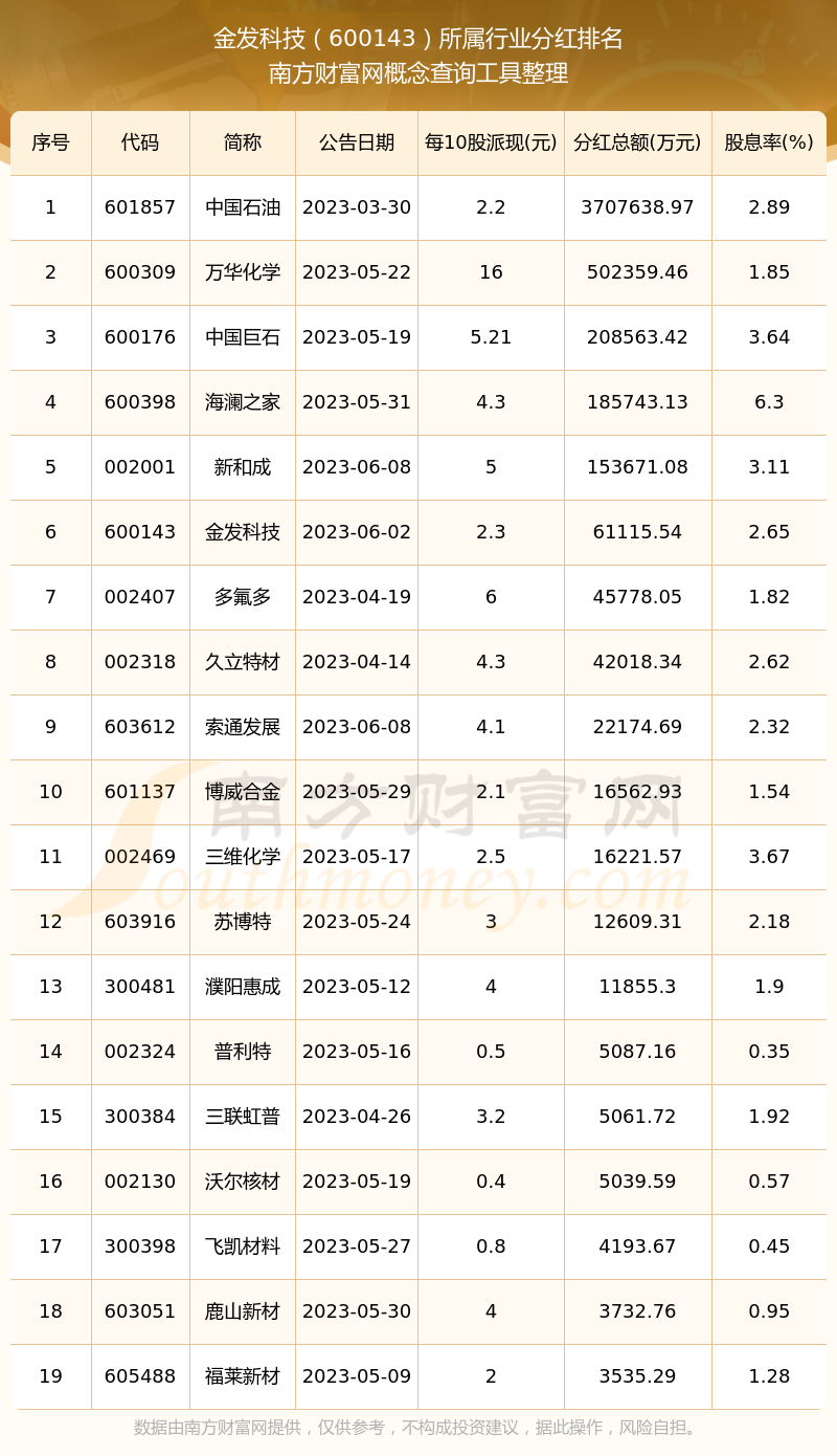 按照南方财富网趋势选股系统统计,金发科技所属行业为改性塑料行业,改性塑料行业分红排名情况如下表:
