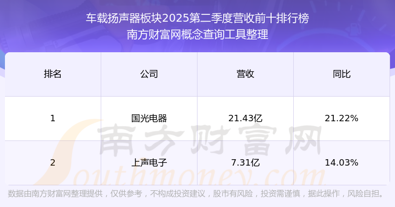 按照南方财富网概念查询工具统计,该股所属板块为车载扬声器板块,该板块共有2只股票,上声电子2025第二季度营收在该板块中排名为第2名,该板块2025第二季度营收排名前十的股票如下表: