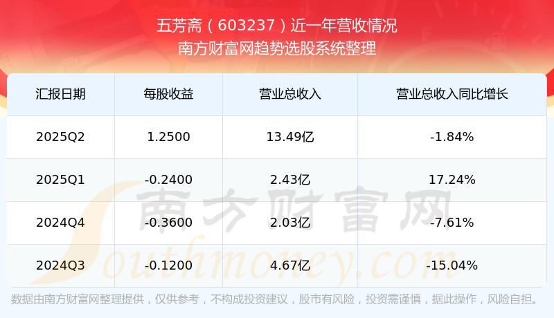 五芳斋2025年第二季度财报显示,公司主营收入13.49亿元,同比-1.84%;归母净利润2.4亿元,同比-20.95%;扣非净利润2.38亿元,同比-19.74%。