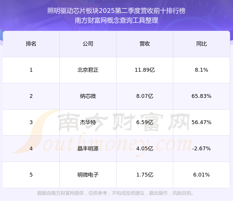 按照南方财富网概念查询工具统计,该股所属板块为照明驱动芯片板块,该板块共有5只股票,晶丰明源2025第二季度营收在该板块中排名为第4名,该板块2025第二季度营收排名前十的股票如下表: