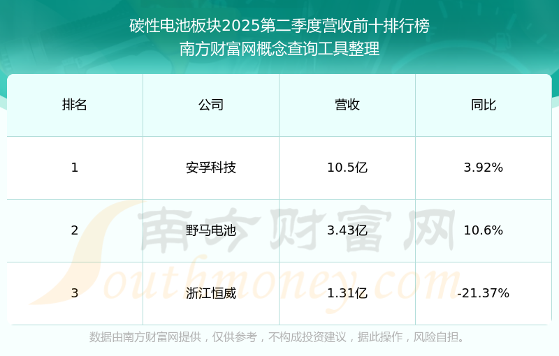 按照南方财富网概念查询工具统计,该股所属板块为碳性电池板块,该板块共有3只股票,野马电池2025第二季度营收在该板块中排名为第2名,该板块2025第二季度营收排名前十的股票如下表: