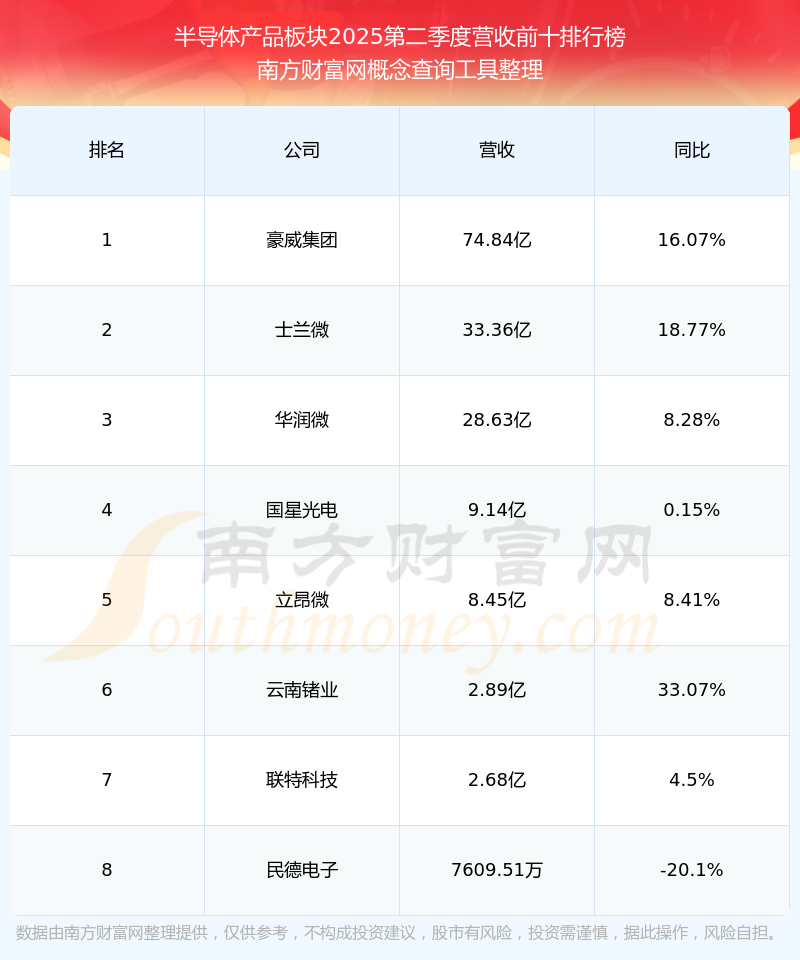 按照南方财富网概念查询工具统计,该股所属板块为半导体产品板块,该板块共有8只股票,闻泰科技2025第二季度营收在该板块中排名为第8名,该板块2025第二季度营收排名前十的股票如下表: