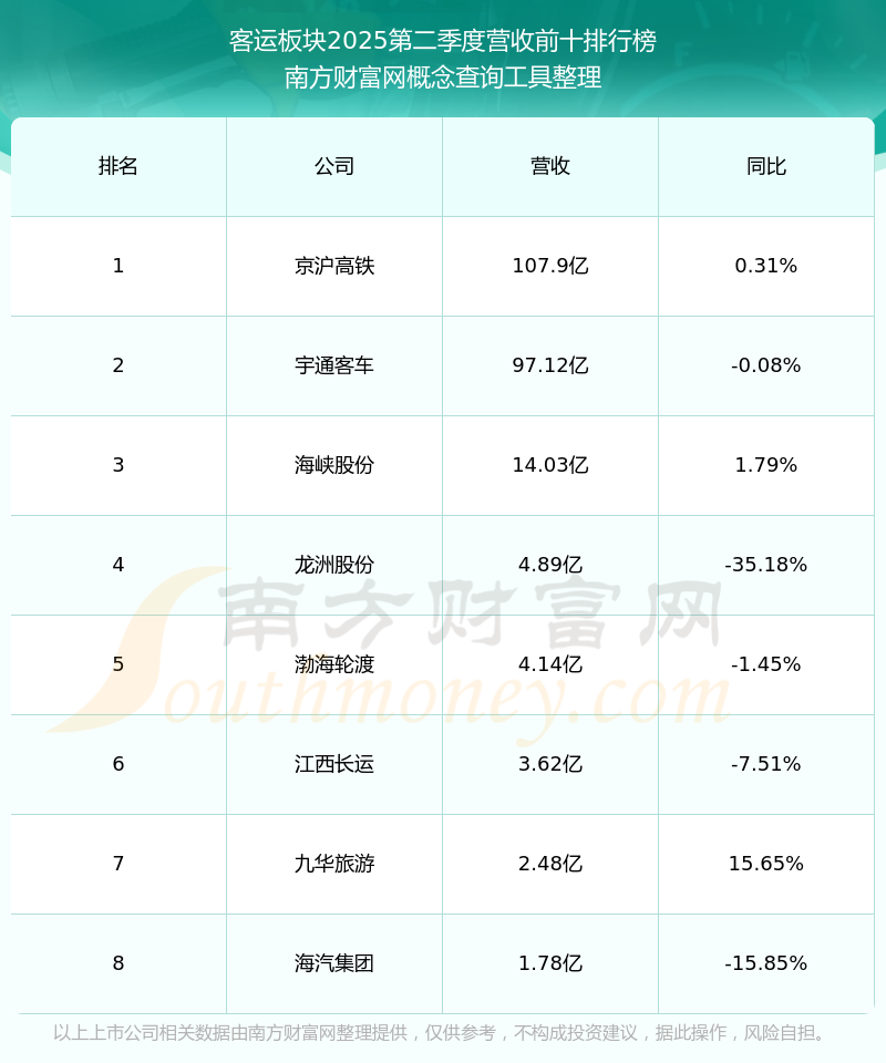 按照南方财富网概念查询工具统计,该股所属板块为客运板块,该板块共有8只股票,京沪高铁2025第二季度营收在该板块中排名为第1名,该板块2025第二季度营收排名前十的股票如下表:
