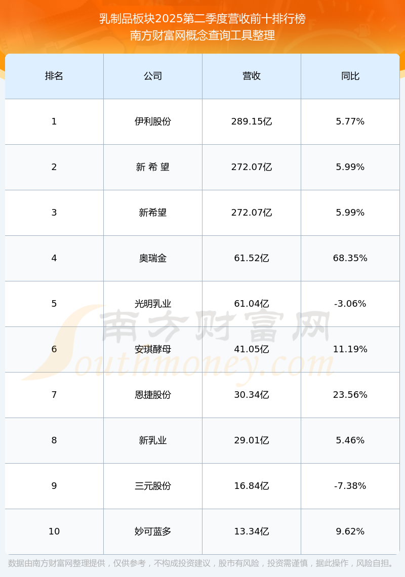 按照南方财富网概念查询工具统计,该股所属板块为乳制品板块,该板块共有33只股票,光明乳业2025第二季度营收在该板块中排名为第5名,该板块2025第二季度营收排名前十的股票如下表: