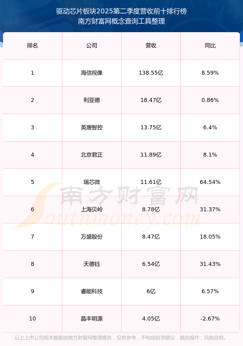 按照南方财富网概念查询工具统计,该股所属板块为驱动芯片板块,该板块共有16只股票,峰岹科技2025第二季度营收在该板块中排名为第16名,该板块2025第二季度营收排名前十的股票如下表: