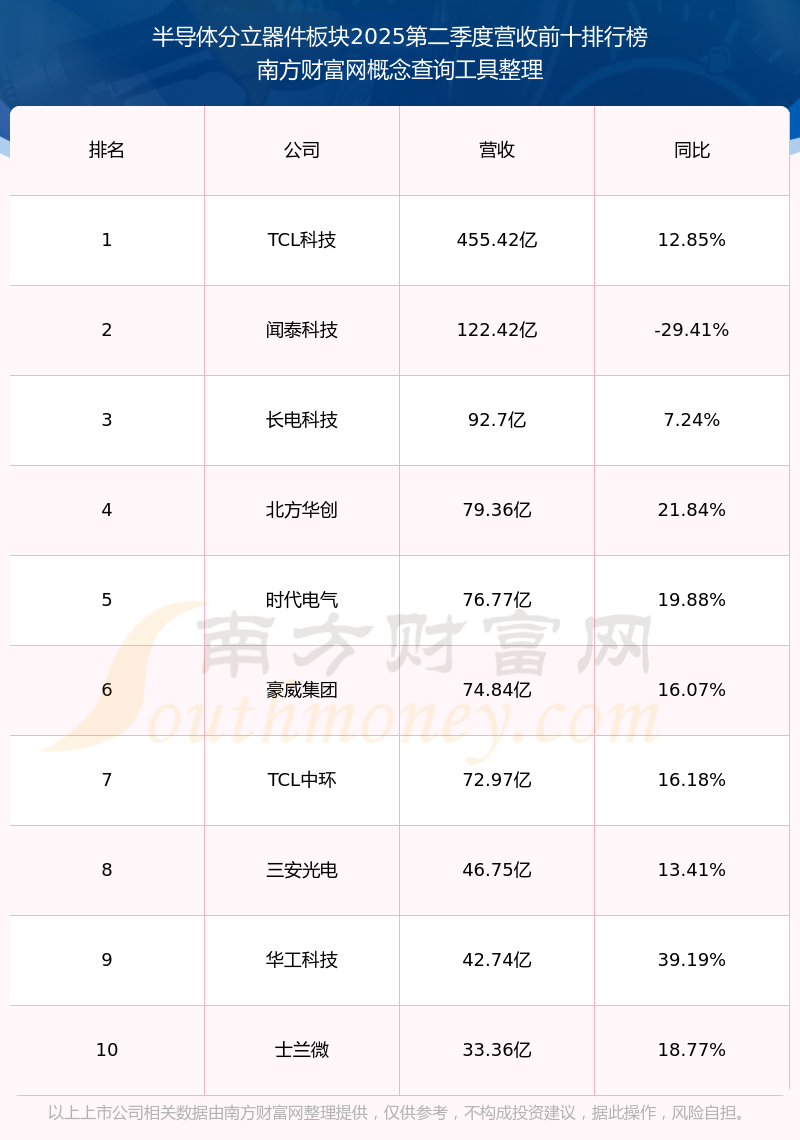按照南方财富网概念查询工具统计,该股所属板块为半导体分立器件板块,该板块共有67只股票,银河微电2025第二季度营收在该板块中排名为第54名,该板块2025第二季度营收排名前十的股票如下表: