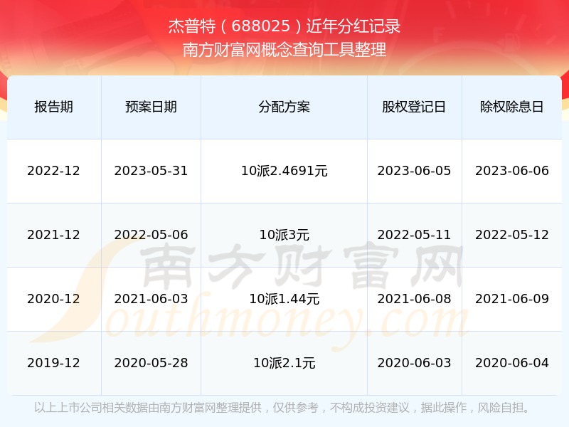 杰普特最新一次公布的分红方案为10派2.4691元。本次权益分派股权登记日为2023年6月5日,除权除息日为2023年6月6日,派息日为2023年6月6日。