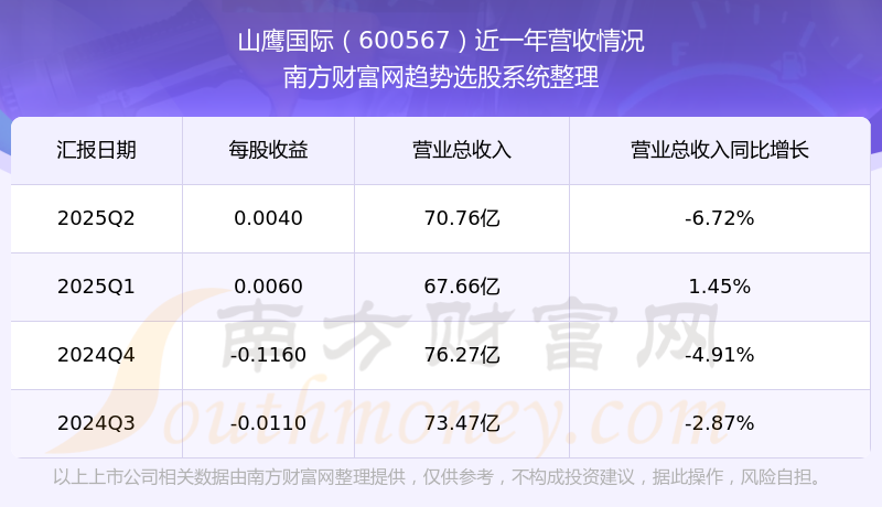 财报显示,2025年第二季度山鹰国际营收70.76亿元,同比增长-6.72%,净利润900.09万元,同比增长-87.92%。