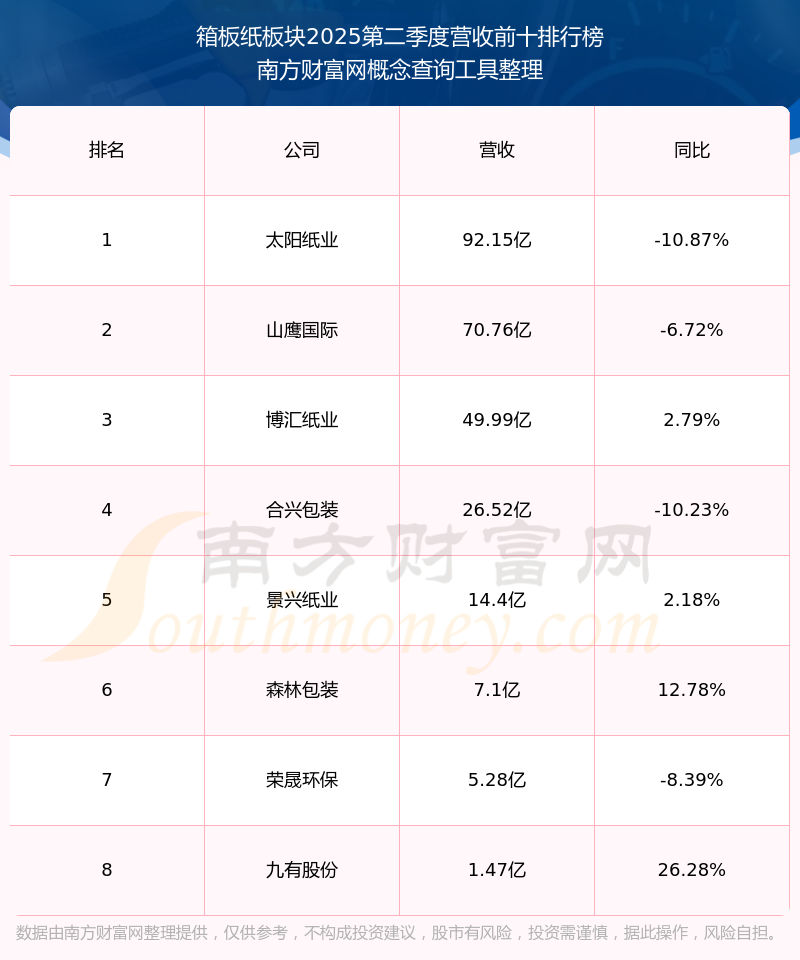 按照南方财富网概念查询工具统计,该股所属板块为箱板纸板块,该板块共有8只股票,山鹰国际2025第二季度营收在该板块中排名为第2名,该板块2025第二季度营收排名前十的股票如下表:
