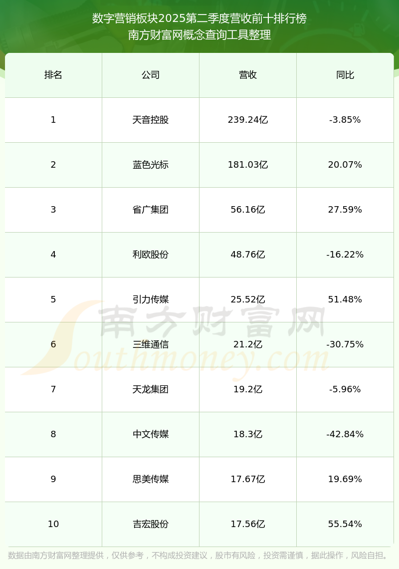按照南方财富网概念查询工具统计,该股所属板块为数字营销板块,该板块共有66只股票,引力传媒2025第二季度营收在该板块中排名为第5名,该板块2025第二季度营收排名前十的股票如下表: