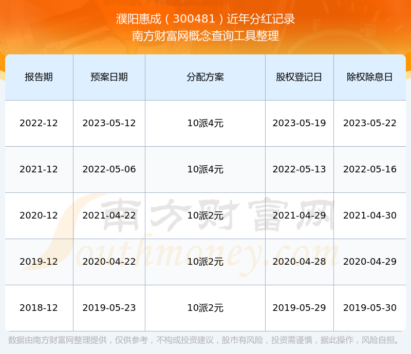 濮阳惠成最新一次公布的分红方案为10派4元。本次权益分派股权登记日为2023年5月19日,除权除息日为2023年5月22日,派息日为2023年5月22日。