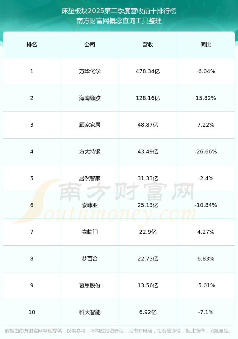 按照南方财富网概念查询工具统计,该股所属板块为床垫板块,该板块共有14只股票,喜临门2025第二季度营收在该板块中排名为第7名,该板块2025第二季度营收排名前十的股票如下表: