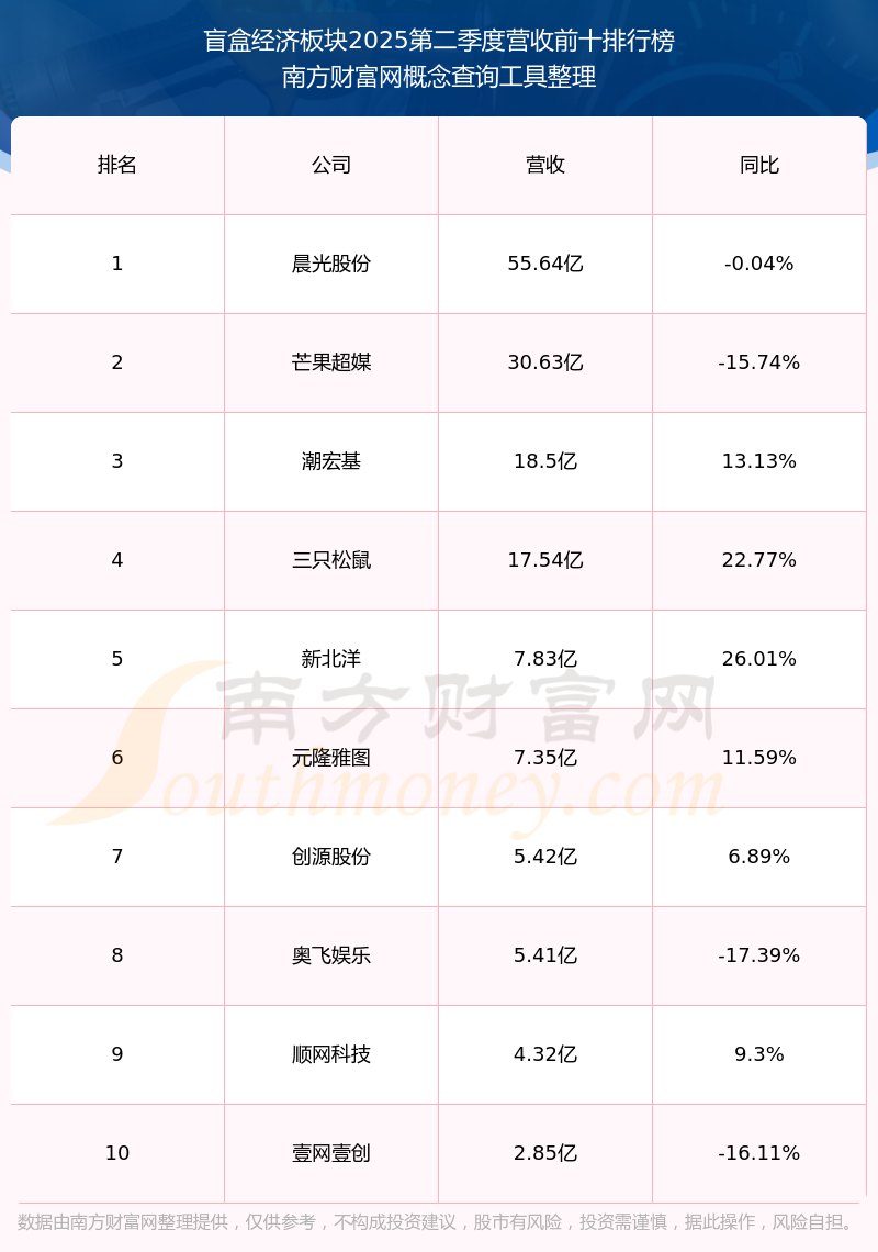 按照南方财富网概念查询工具统计,该股所属板块为盲盒经济板块,该板块共有15只股票,沐邦高科2025第二季度营收在该板块中排名为第13名,该板块2025第二季度营收排名前十的股票如下表: