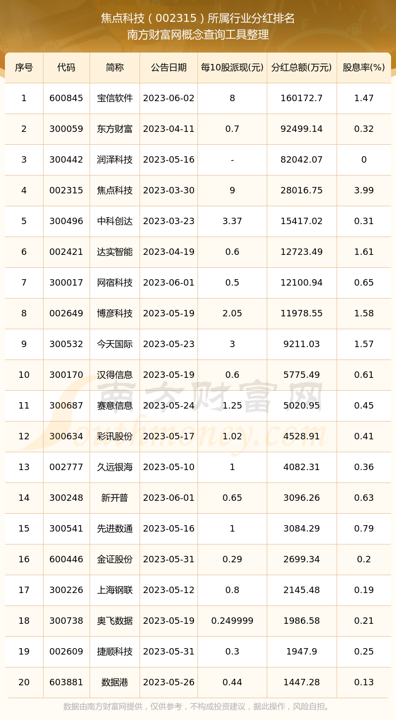 按照南方财富网趋势选股系统统计,焦点科技所属行业为互联网服务行业,互联网服务行业分红排名情况如下表: