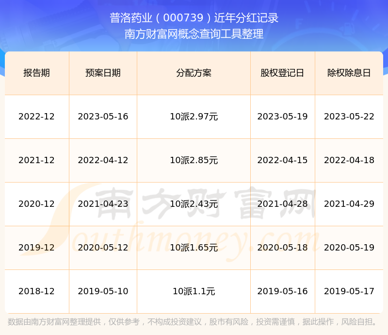 普洛药业最新一次公布的分红方案为10派2.97元。本次权益分派股权登记日为2023年5月19日,除权除息日为2023年5月22日,派息日为2023年5月22日。