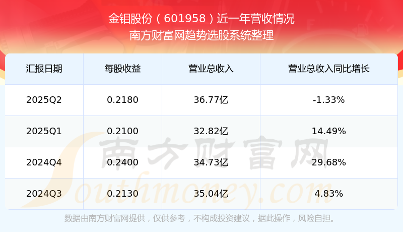 金钼股份2025年第二季度报告显示,公司实现主营业务收入36.77亿元,较去年同期增长-1.33%;归属于母公司股东的净利润为7.04亿元,同比增长-19.39%;扣除非经常性损益后的净利润为7.22亿元,同比增长-16.11%。